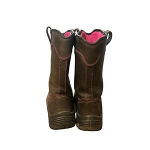 The Avengers work boots are sturdy and durable farmer Wellington boots in size 9. These unisex boots feature a steel toe design and are crafted from full grain leather, making them perfect for both men and women. The brown color and classic Wellington style give them a timeless and versatile look, ideal for any rugged outdoor job or casual outing. With the brand name Avengers Work Boots, you can trust that these boots are built to last and provide the protection and stability you need for any work environment.
