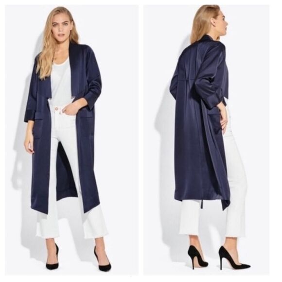 ayr - crystal cove jacket satin duster collared open front midi navy blue