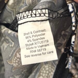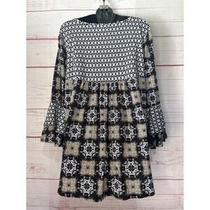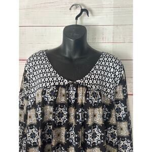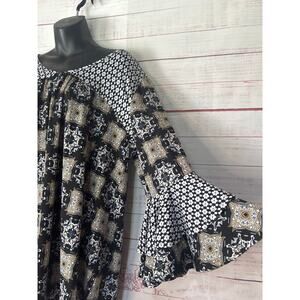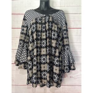 Details : V Cut neckline blouse, multi geometric print featuring shades of white, blues, green with contrasting navy and white floral print. Tiered Ruffled elbow length bell sleeves.