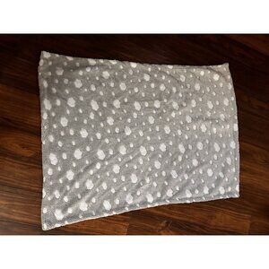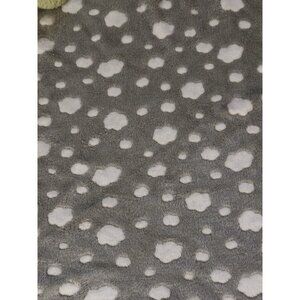 10” shaggy soft green frog with fully embroidered face. The blanket is thin velour/velvet-y feeling grey with white clouds and is 36.5” by 28” when stretched out.