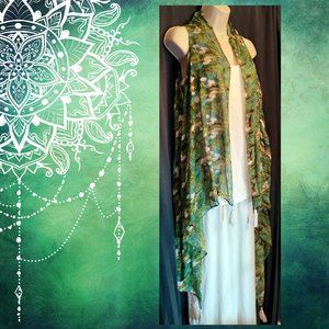 Long, full, and flowy vest with tassels. One size. 100% Viscose, made in India. Hand Wash. This item is in good condition and shows little sign of wear.