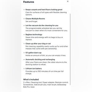 Schedule floor cleaning with this bObsweep Pro robotic vacuum cleaner. The 500ml collection container reduces emptying frequency and is washable for easy maintenance. This bObsweep Pro robotic vacuum cleaner can run up to 100 minutes on a single charge and can handle up to 1000 sq. ft. of tiled or carpeted flooring for hands-off cleaning.