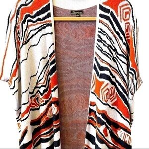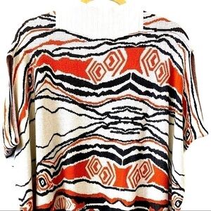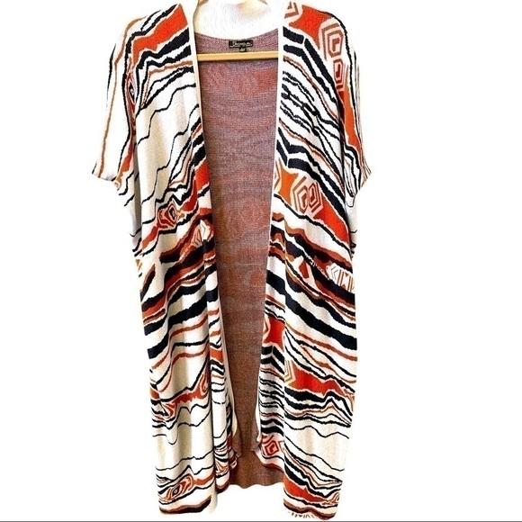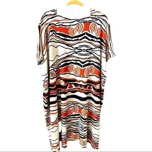41 inches long, fun artistic print, soft draping material, 100 % viscose, looks great with so many outfits