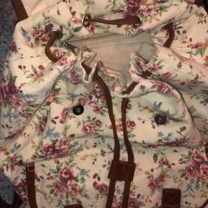 floral print adjustable straps pockets fasten by pull strings and snap buttons good condition