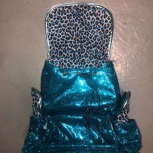 blue sparkle backpack with cheetah print inside!! great quality brand new never used!!