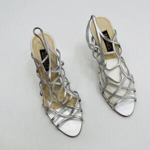 badgley mischka silver leather cage heels