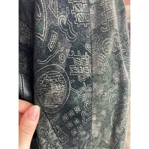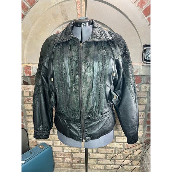 wonderful leather jacket with such cool geometric patterned leather on the front back and shoulders. a perfectly badass 1990s jacket. has 2 small defects on the front and side see photos.