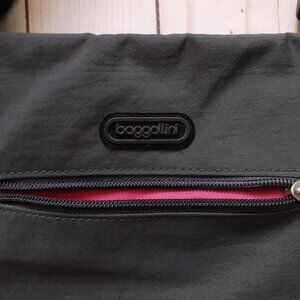 Very good pre-owned condition. baggallini One Way Crossbody Bag. Color: Gray with bright pink lining and black strap.