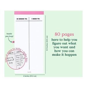To do list notepad includes 80 sheets with 2 columns - "In order to" and "I need to" - to help you figure out what you want and how you can make it happen