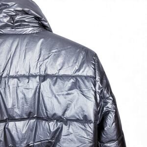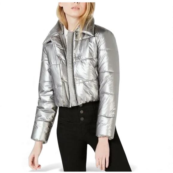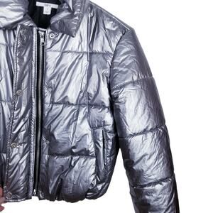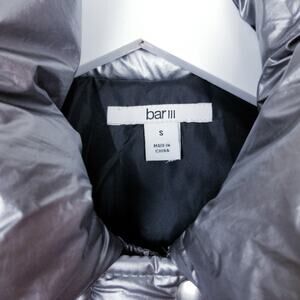 bar III Silver Metallic Puffer Jacket. Puffy point collar, zipper closure at front, side pockets. Shell: nylon. Lining: polyester. Machine washable.