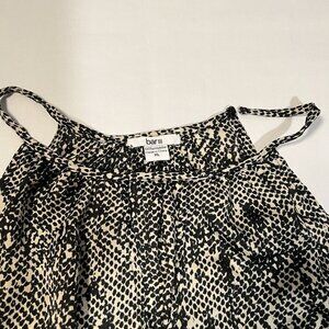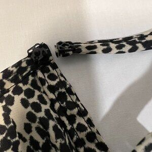 Black and white lightweight animal print tank top elastic waist jumpsuit. Only opening is a small snap at the left neck line strap. No pockets. Wide leg.