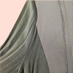 This smooth, soft cropped jacket could also be worn as a stand alone top. Many cool features including hidden brass asymmetrical zipper, contrasting textures and layers, decorative raw seaming, and a cowl type neck when fully zipped. Two front pockets are a bonus. Darker green knit sides. Super unique piece.