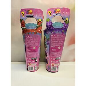 Unbox to find a grape fizz-scented and posable Barbie doll, a squishy and scented pet puppy and accessories that match the fruit flavor theme!