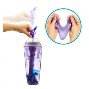 Kids remove the outer layer of packaging, open the cup and pull out the surprise bags, then screw the lid back on and pop the top with the straw-like piece to release squishy, purple Slime over the ice cubes!