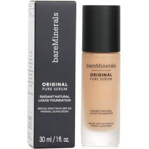 bareMinerals Original Pure Serum Radiant Natural Liquid Foundation Mineral SPF 20 is 93% skincare-infused and made with only 23 ingredients. This clean foundation is silicone-free, fragrance-free, chemical screen-free, and oil-free. Plumping hyaluronic acids, hydrating glycerin and skin-nourishing white water lily flower help smooth skin. Non-nano titanium dioxide active helps protect skin from damaging UVA, UVB, free radicals and infrared sunlight.
