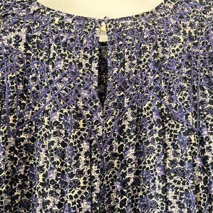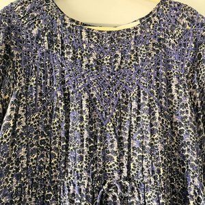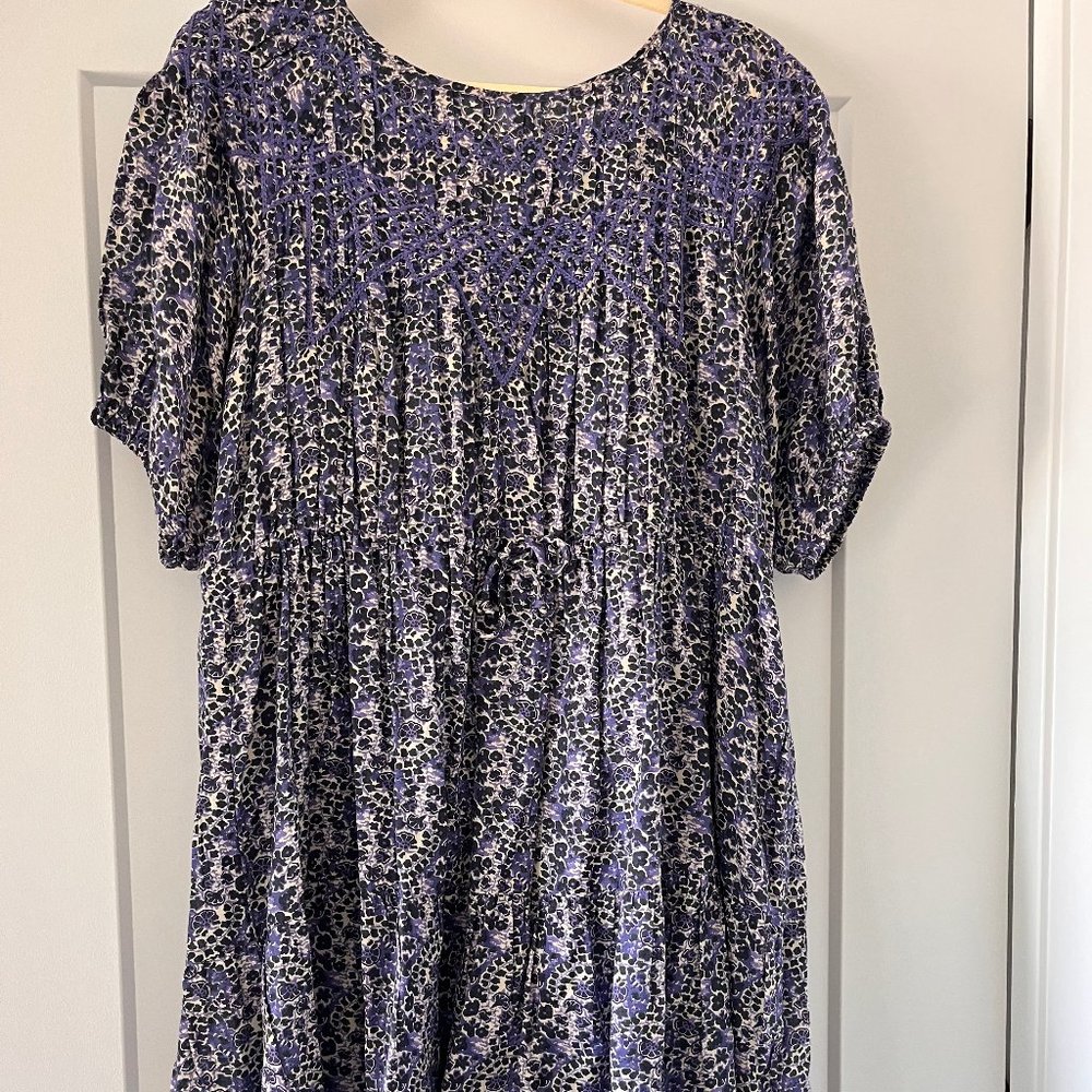 Purple, navy and cream ba&sh dress with intricate embroidery on the neckline and a tie waist.