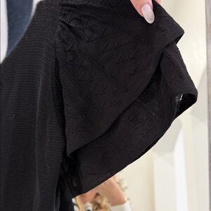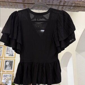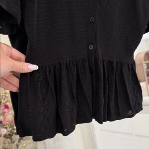 Stylish black blouse with button closure. Features layered ruffle sleeves and a flattering peplum design. Ideal for any occasion.