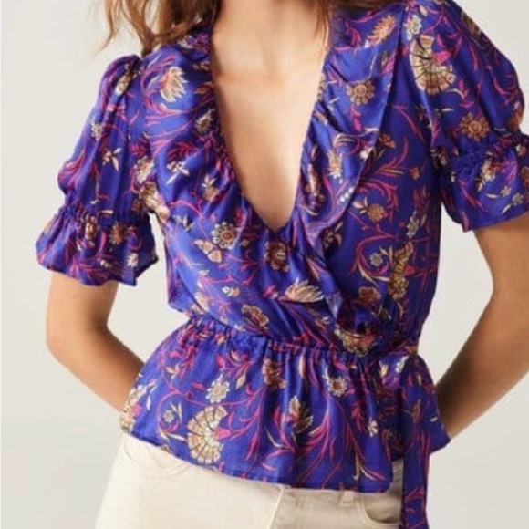Chic wrap blouse with floral pattern. Features a deep V-neck and puff sleeves. Perfect for stylish outings.