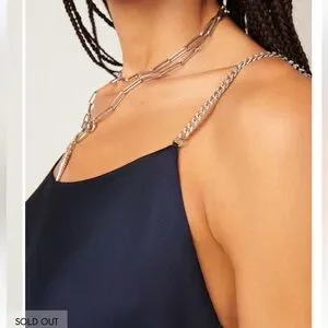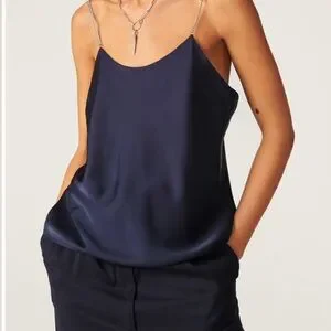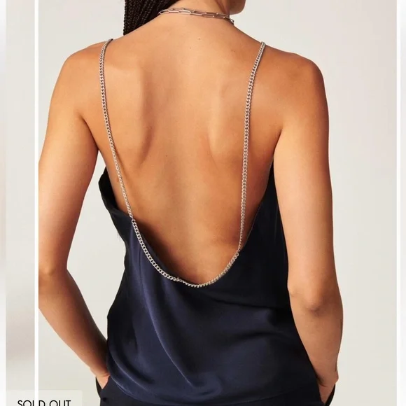 The ba&sh CISCO top has sassy style. This Auid sleeveless top has chain straps with rhinestone and a revealing back. In soft, flowing fabric with satin finish. A lovely, typically ba&sh top for evening wear.
