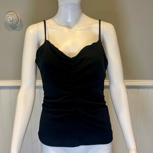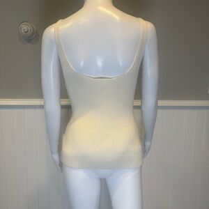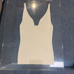 Elegant cream ribbed tank top. Features a deep V-neckline. Perfect for layering or wearing alone.