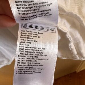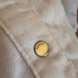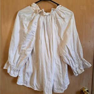 Lightweight cream button-down with ruffled collar. Three-quarter sleeves with smocked cuffs. Relaxed, flowy silhouette. Subtle front button closures for easy wear.