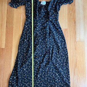 Timeless and beautiful designer dress in a unique “bleunuit” color featuring midnight blue and cream hues. The pattern looks like an abstract mix of small blue flowers. Midi length, sweetheart neckline, wrap waist, short sleeves and smocked back. Originally retailed for $395, sold out in stores and online!