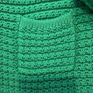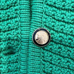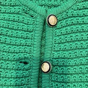 Chic emerald cardigan with textured knit. Features gold button accents and front pockets. Perfect for layering.