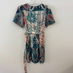Designed with a flattering wrap silhouette and slight blouson waist this mini dress has two-tone floral print.Surplice neckline. Short Sleeves. Wrap dress.