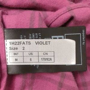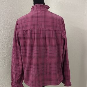 Elegant fuchsia checkered blouse with ruffle accents. Features button-up design. Ideal for stylish outfits.