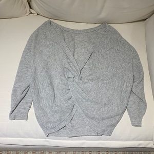 Elegant gray sweater with open-back design. Features a twisted knot detail. Perfect for stylish layering.