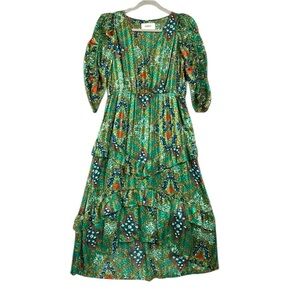 ba&sh Happy Dress Tiered Ruffle Shimmer Metallic High Low Midi Size 3 Large Green