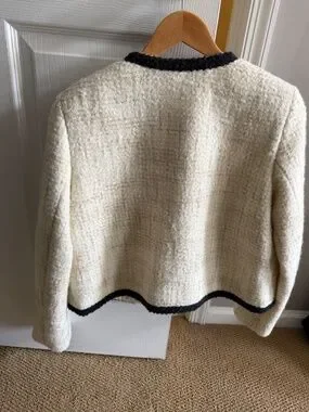 New with tags. Jacket, tweed, bouclé, solid color with appliqués, piped trims, button-embellished, crewneck, single-breasted , long sleeves, fully lined, snap fastenings, flap pockets, dry clean, do not bleach, do not tumble dry, power dressing meets elegance in this chic office outfit that will inspire confidence every day , Color: Ivory Size 2.