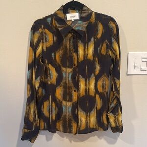 Stylish ba&sh blouse with a vibrant multicolor pattern. Features a button-up front and long sleeves. Perfect for a chic look.