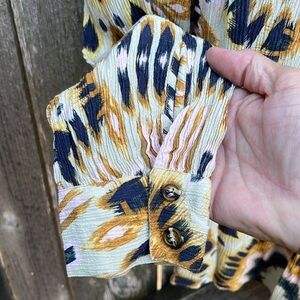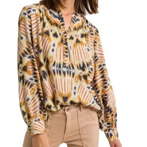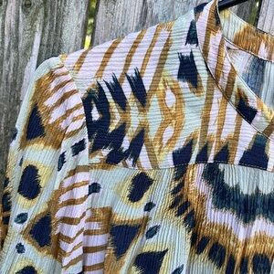 Excellent condition; Gorgeous! Crinkle viscose; button up neckline (halfway); button cuffs; pit to pit measures approx. 21” across; shoulder to hem measures approx. 24”; prettier in person; retails @$265.00