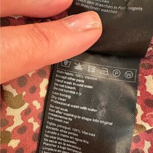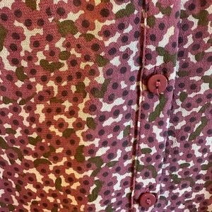Elegant blouse with a delicate floral purple and dark green pattern. Features a ruffled neckline that can lay flat or up and long sleeves. Ideal for any occasion. 100% viscose. Pit-to-pit 22"; shoulder-to-hem 25"