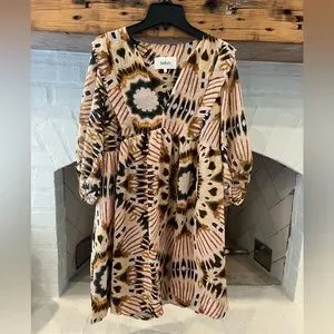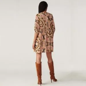 Stylish dress with a vibrant pattern. Features a relaxed fit and three-quarter sleeves. Perfect for any occasion.