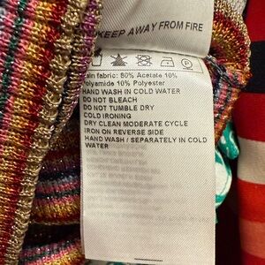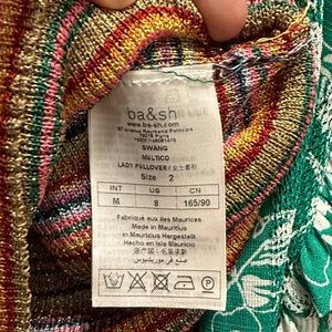 Stylish knit top with multicolor stripes. Features short sleeves and a round neckline. Perfect for casual wear.