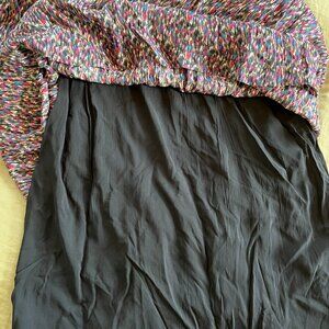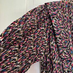 New never worn. Multicolored print with silver metallic lurex stripes.