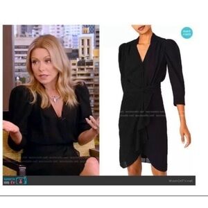 This sophisticated black dress by ba&sh features a striking plunge neckline and elegant puff sleeves, perfect for a cocktail night out. The asymmetrical wrap design and notched collar add a modern twist to its classic sheath silhouette, ensuring a chic and timeless appeal.