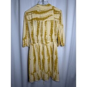 This relaxed, bohemian charmed dress is so fashionable that it was worn and shown on TV. The short dress has a round collar and 3/4 length sleeves. With a button placket all the way down the front and a shoulder yolk. slightly textured viscose crepe with a stripe in a shiny metallic silver thread. The tie-dye print is a unique touch. The drawstring which allows many fits and gently showcases the waist. This dress would look great styled with boots or sandals. Made of 97% viscose and 3% metallized fiber.