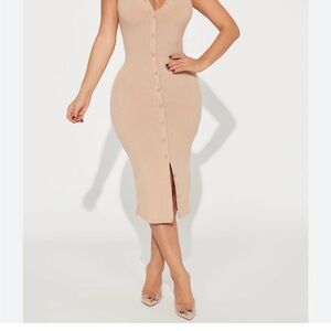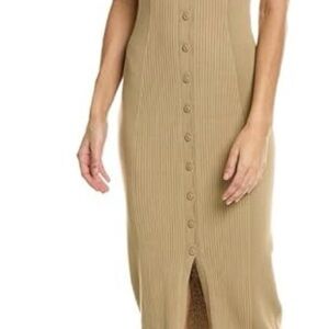 This tan sheath dress by ba&sh features an asymmetrical slit and ribbed texture, perfect for casual or cocktail occasions. The sleeveless design with a scoop neckline adds a modern touch, while the midi length offers a sophisticated silhouette.