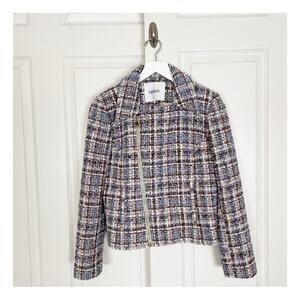 multi-color (purple, tan, brown, off white) Tweed Lady Jacket from ba&sh. moto silhouette with off center zip closure. pockets, lined. 47% poly 30% wool 19% acrylic 3% poly 1% viscose. EUC - just a couple tiny pics/ slubs (they blend with tweed texture in my opinion).