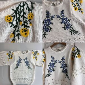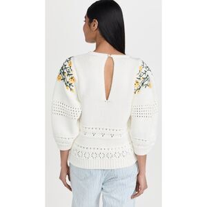 Cut in a boxy silhouette, this puff-sleeve sweater is enhanced by intricate floral embroidery and openwork knitting.