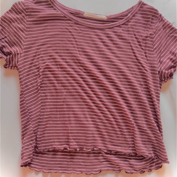 super soft! easy to style! cropped striped tee shirt with lettuce hem. maroon and white colors.