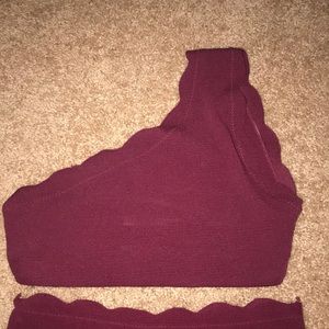 maroon bathing suit, high waist bottoms, cross the shoulder top