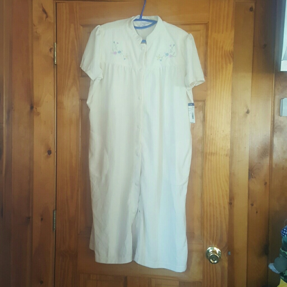 cream color short sleeve pink blue yellow embroidered flowers on each shoulder pockets