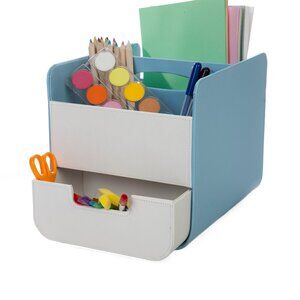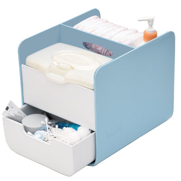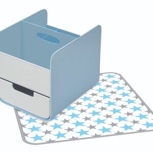 The portable change station that adds a touch of style and practicality to any room. Does double duty after diaper stage as an art box, makeup caddy, kitchen organizer and more. Color is Blue. Storage for diapers. Space for your wipes box. Drawer for storing creams and more. Removable divider to separate pump creams or powder from diapers. Easy to clean surfaces inside and out. Dimensions: Length: 10 inches; Width: 11 inches; Height 10 inches. Smoke-free home. Brand new. Great baby gift.