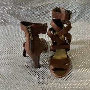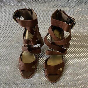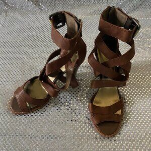BCBG Girls Womens Open Toe Criss Cross Strap brown Heel Sandals Sz 5.5 Used once