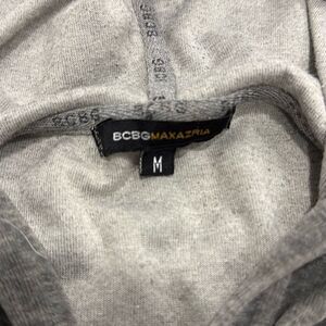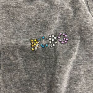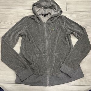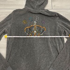 bcbg maxazria gray zip up size medium with a crown jewel detailing sewed on.. super y2k and iconic. Some stones came out from the front of the sweater