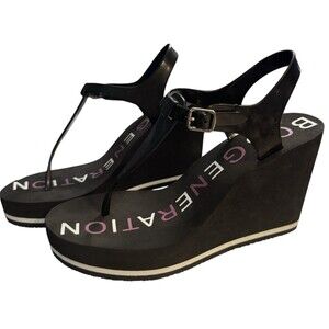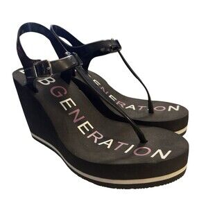 The product is a pair of BCBGeneration black wedge strap sandals in size 8 for women. These stylish sandals feature a comfortable wedge heel and a secure strap design, making them perfect for a fashionable and casual look. Perfect for any outfit, these sandals are a versatile and trendy addition to any wardrobe.